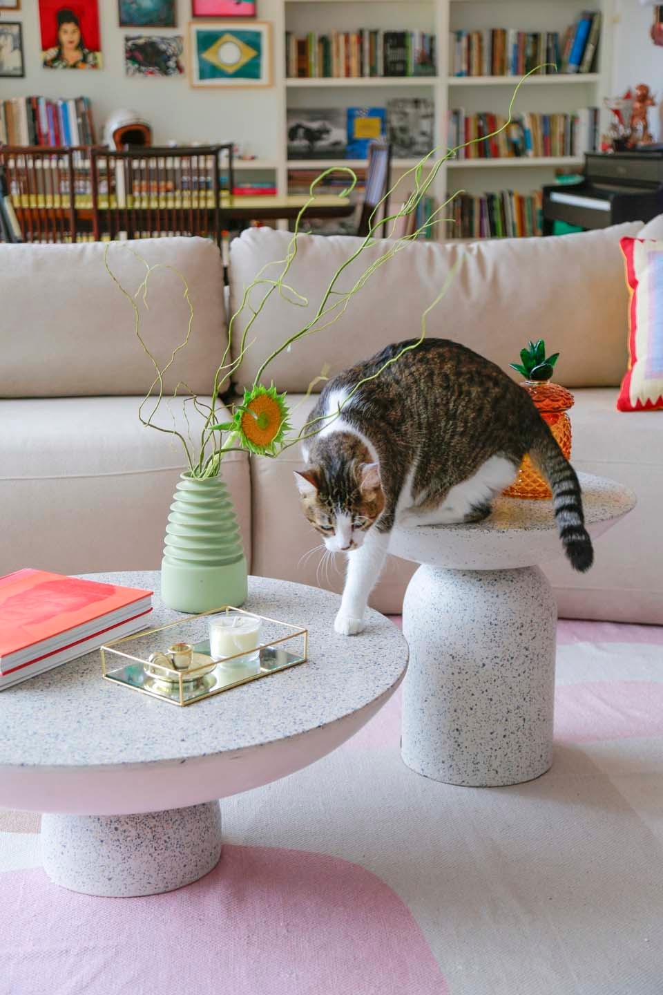 Кожаный диван Ettore придает комнате индивидуальность, а рядом расположена работа художника Брендона Рейса. В гостиной обустроена зона отдыха с панорамным видом на все комнаты, включая спальню с окном от стены до стены. Гостиная и столовая с открытой планировкой также располагают большим окном с видом на город. Здесь можно увидеть мебель разных цветов, например, ярко-желтый стол. Стены украшены фотографиями и картинами, а повсюду расставлены растения в горшках.