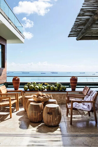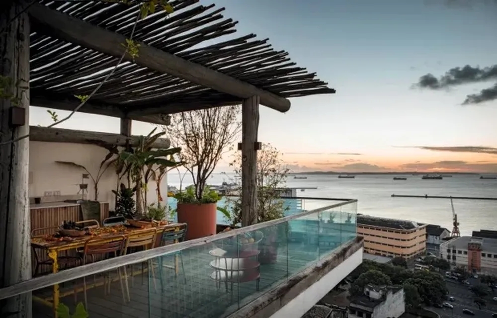 Современная панорамная терраса украшена керамическими вазами, приобретенными на ярмарке в Сан-Жоакиме, и предлагает захватывающий вид на залив Всех Святых.